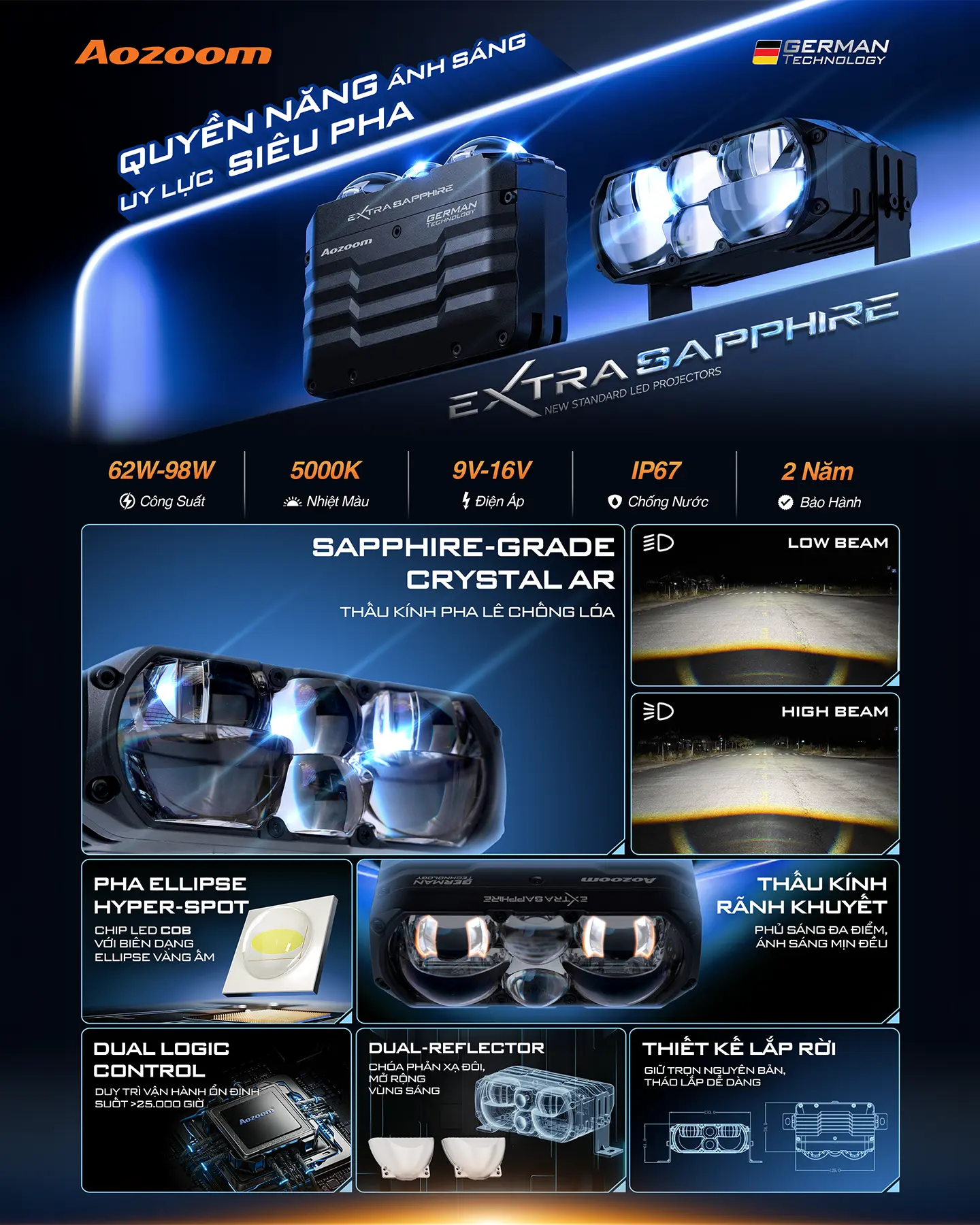 Sapphire từ lâu đã được xem là biểu tượng của sự thông tuệ, thịnh vượng và quyền năng hoàng gia. Không chỉ sở hữu sắc xanh huyền bí, Sapphire còn đại diện cho sự kiên định và khả năng bảo vệ chủ nhân trước những sóng gió. Lấy cảm hứng từ giá trị vĩnh cửu đó, AOZOOM chính thức giới thiệu EXTRA SAPPHIRE – phiên bản đặc biệt (Special Edition) trong hệ sinh thái đèn tăng sáng dạng rời. Đây không đơn thuần là một thiết bị chiếu sáng, mà là món trang sức tinh tế, góp phần khẳng định vị thế và sự thấu đáo của người cầm lái.