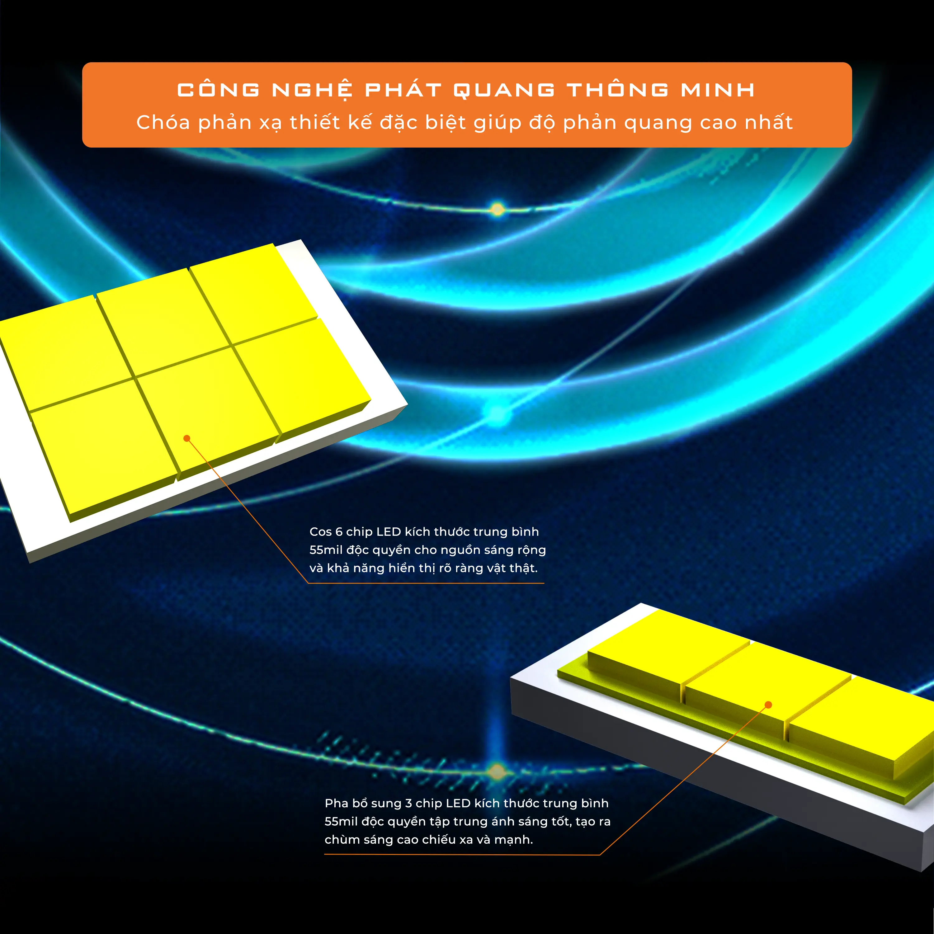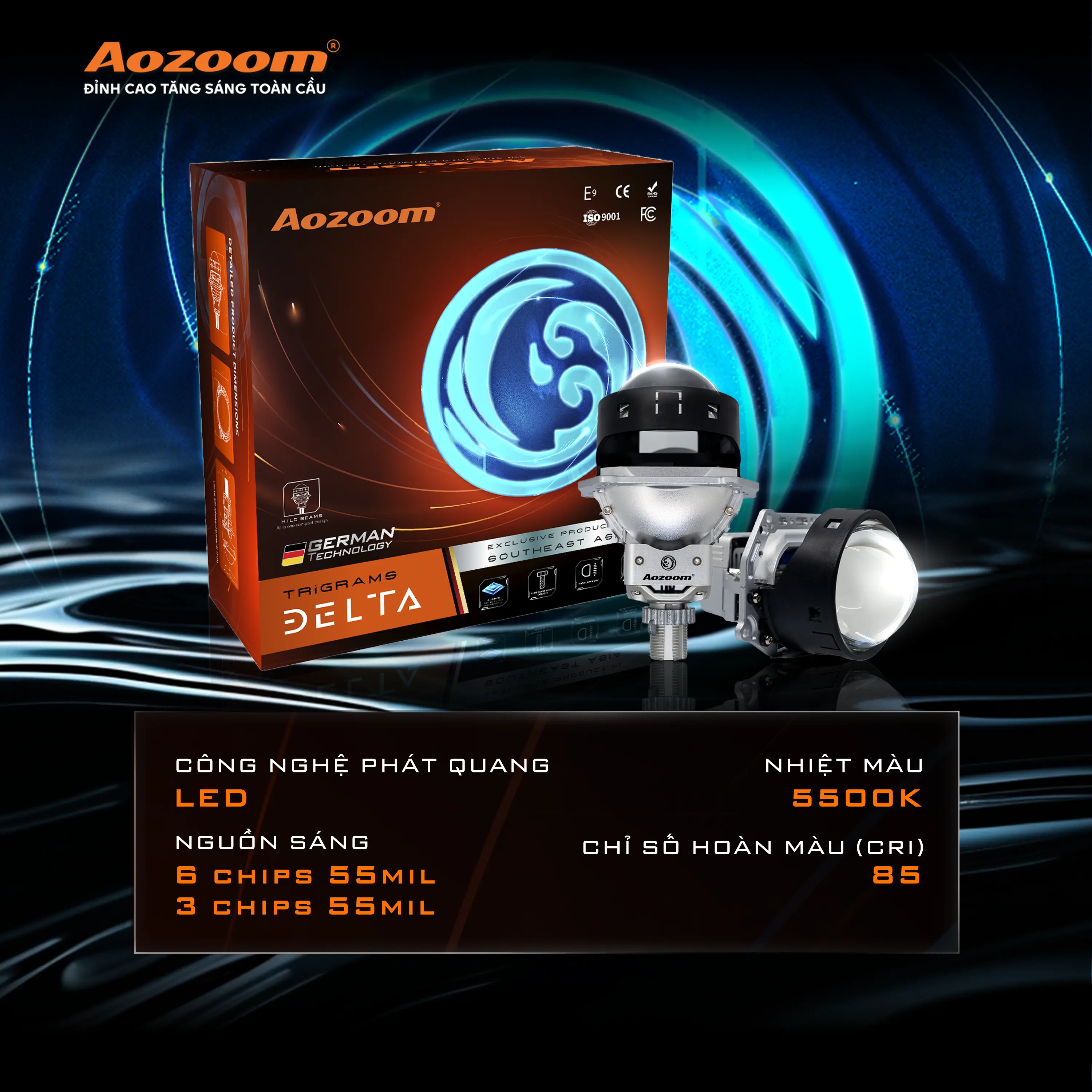 Tích hợp công nghệ chip LED tiên tiến bản trung 55mil độc quyền từ AOZOOM, hiệu suất phát quang cao, đảm bảo ánh sáng ổn định và tiết kiệm năng lượng