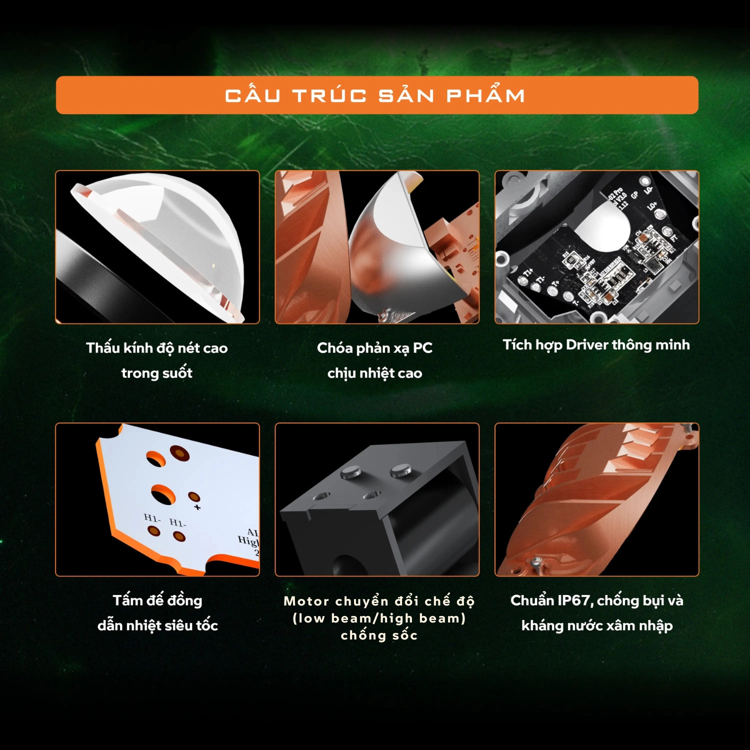 7 chip LED AOZOOM công nghệ Đức độc quyền cùng màn trập tiên tiến, cho mặt cắt sáng phẳng đẹp, tự nhiên và có độ bám đường tốt.