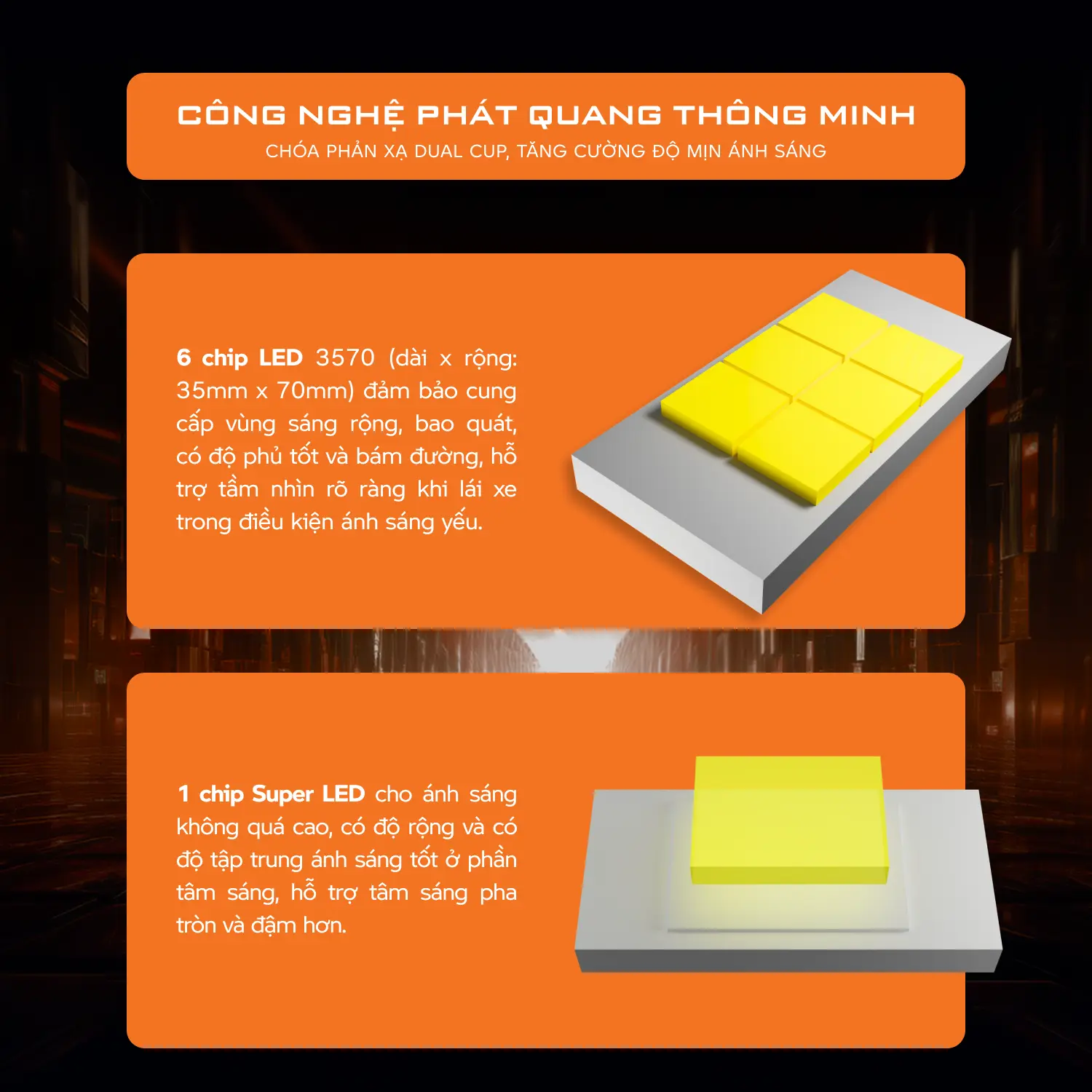 Công nghệ DUAL CUP - Tích hợp thêm nhân và chóa LED phụ tăng cường độ mịn của ánh sáng cos, giúp ánh sáng có độ hội tụ, tăng cường vùng ánh sáng trung tâm hỗ trợ cải thiện khả năng quan sát trong điều kiện ban đêm hoặc thiếu sáng.