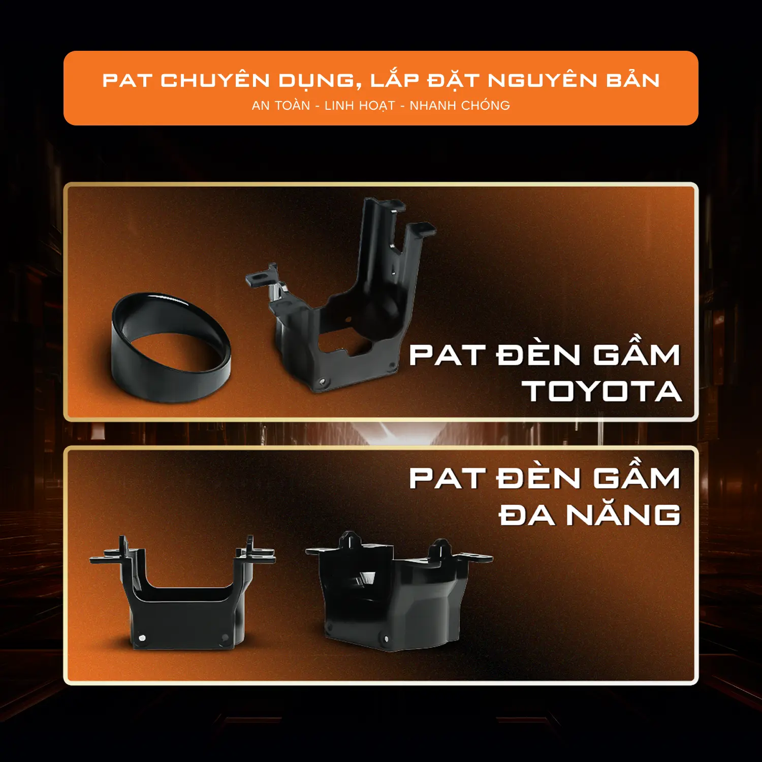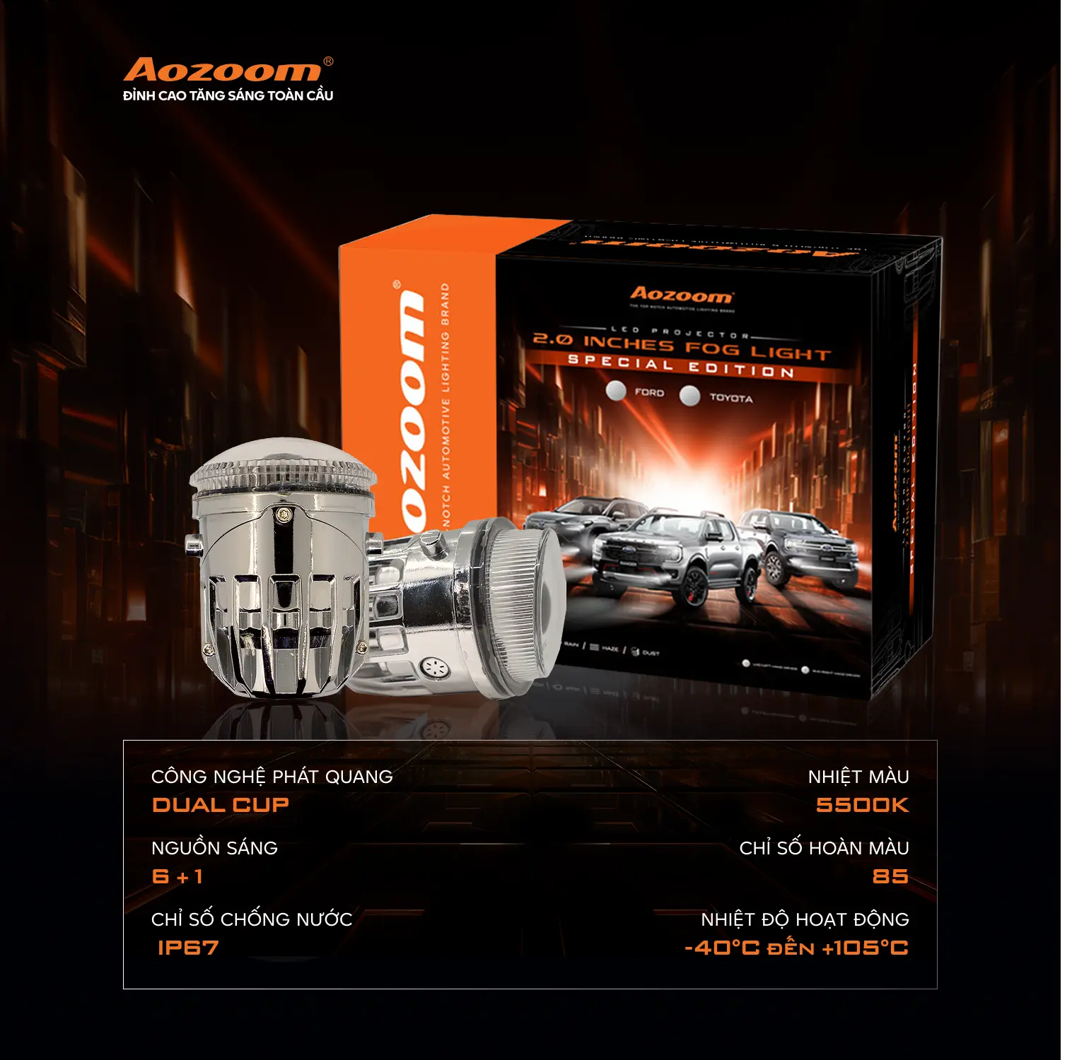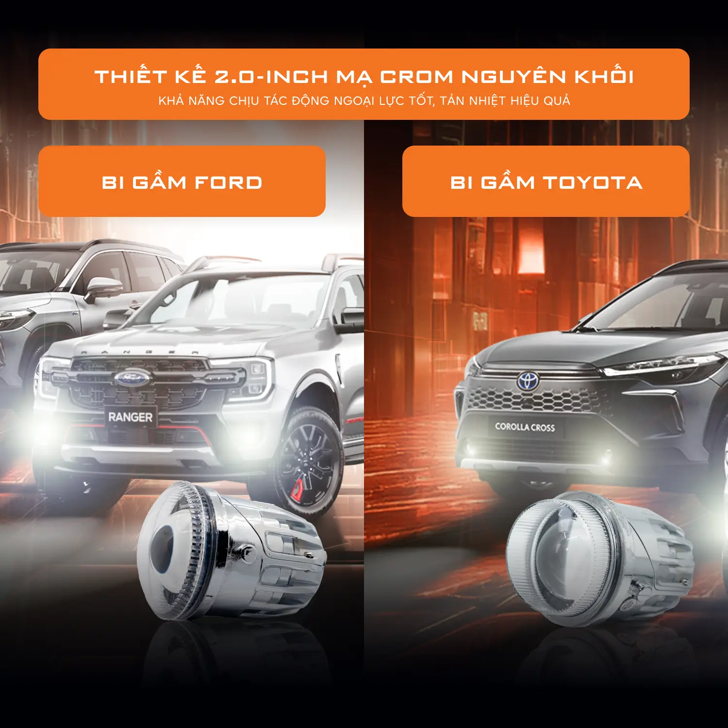 SPECIAL FOG LIGHT FOR FORD/TOYOTA - Giải pháp đèn gầm 2.0 inch được thiết kế chuyên biệt cho các dòng xe thế hệ mới. Với hai phiên bản chân pát riêng biệt, sản phẩm đảm bảo khả năng lắp đặt Plug & Play nhanh chóng, đơn giản hóa mọi quy trình thi công. Sức mạnh vượt trội nằm ở Công nghệ DUAL CUP đột phá - hệ thống chóa kép kiến tạo chùm sáng Cos siêu mịn, bám đường và đồng đều. Kết hợp cùng chip SUPER LED với hiệu suất phát quang cao hơn 30%, sản phẩm mang lại cường độ sáng mạnh mẽ, ổn định, nhưng vẫn duy trì sự bền bỉ với hệ thống tản nhiệt thông minh và chuẩn IP67.