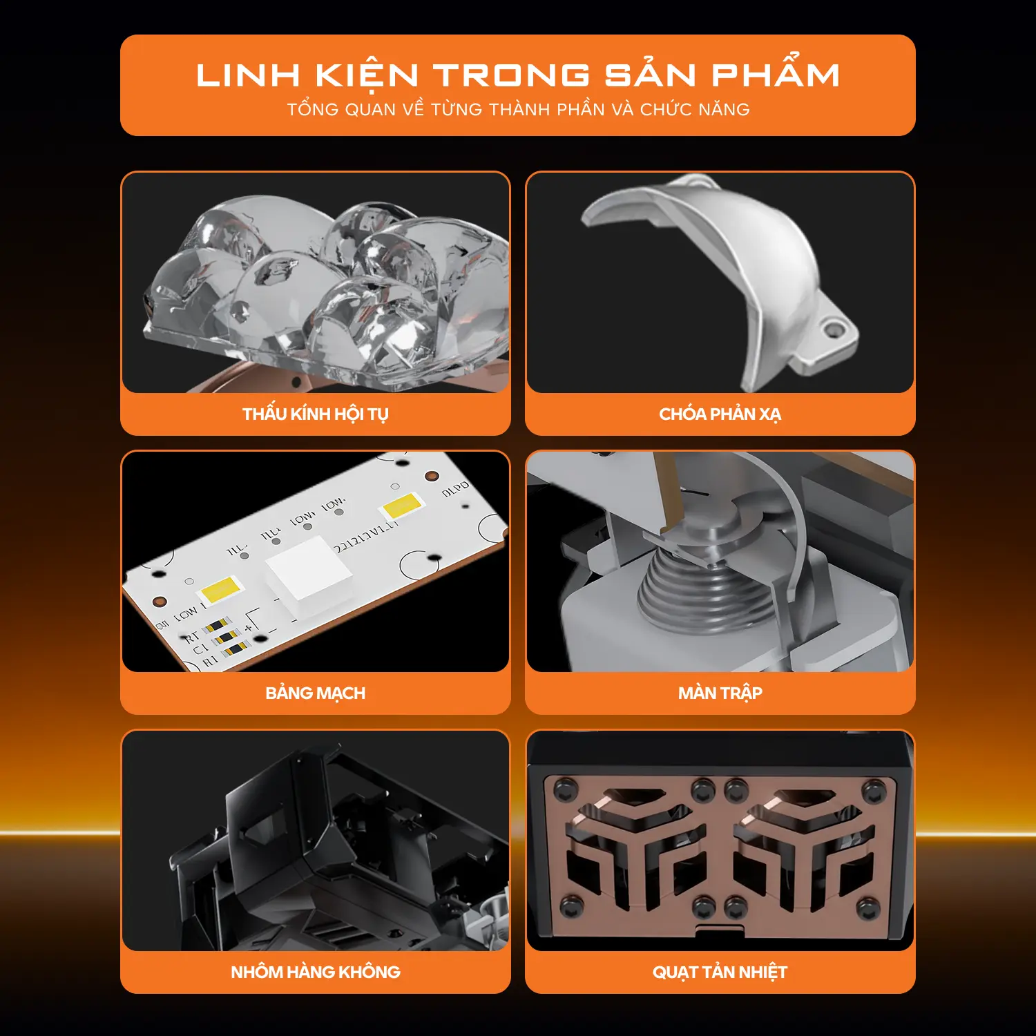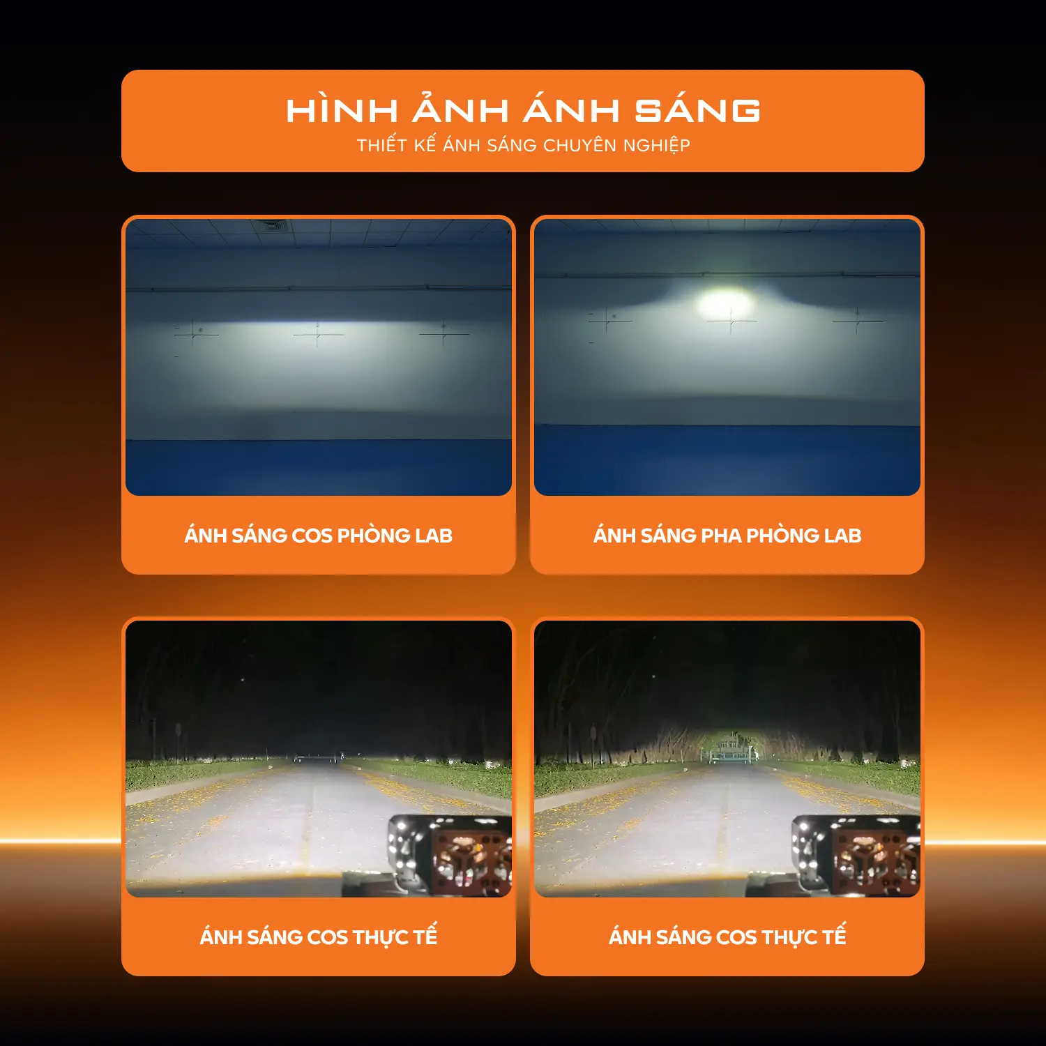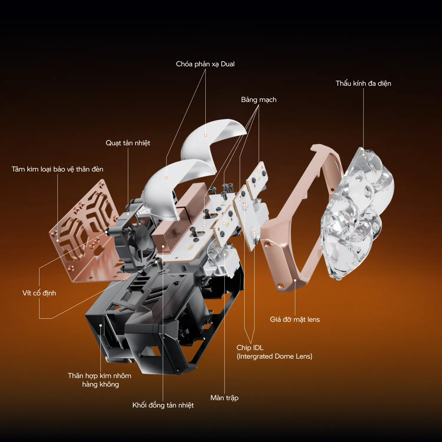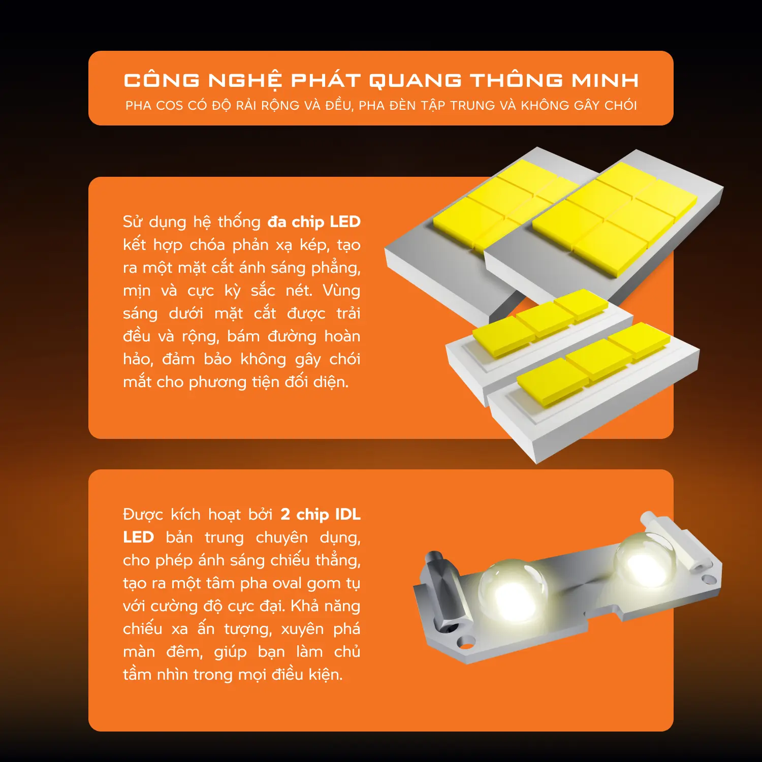 Kiến trúc ánh sáng đa lõi phức hợp được tạo nên hệ thống chóa phản xạ kép tăng cường cho chế độ cos & pha chiếu trực tiếp từ chip IDL LED bản trung lên đến 20 chip, tạo ra vùng chiếu sáng dày đặc, mạnh mẽ và bao phủ tuyệt đối.